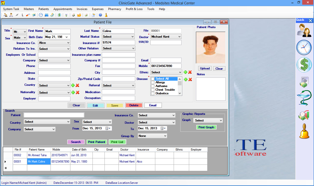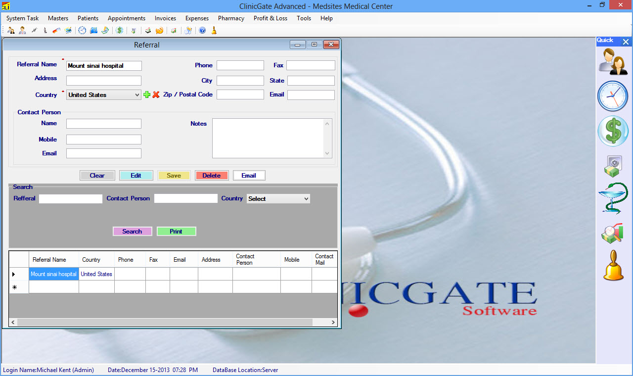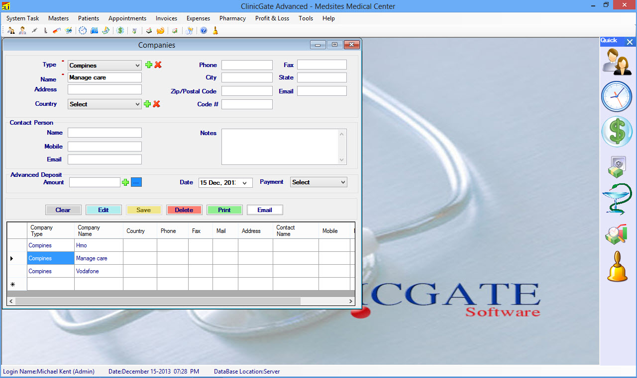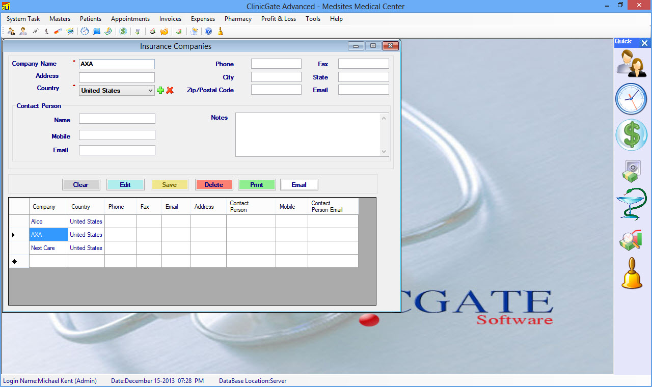 ClinicGate es un software médico integral que presenta una interfaz Windows intuitiva que integra a la perfección sistemas de registro médico electrónico (EMR), facturación médica, programación de citas, Historia Clínica Electrónica (HCE), códigos CIE-10, procesamiento de reclamaciones de seguros CMS 1500, seguimiento de cuentas por cobrar, gestión de gastos y generación de informes personalizados e información gráfica.