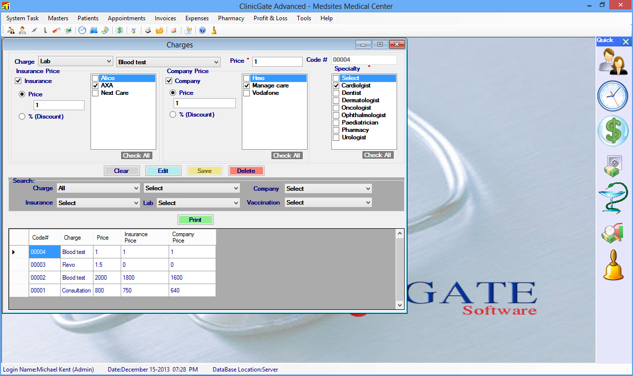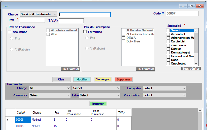 Agregar, editar y eliminar cargos de la clínica por especialidad