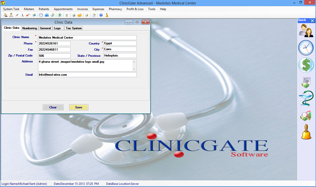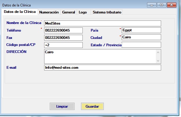 Editar nombre, dirección, números de teléfono, sistema tributario y logotipo de la clínica