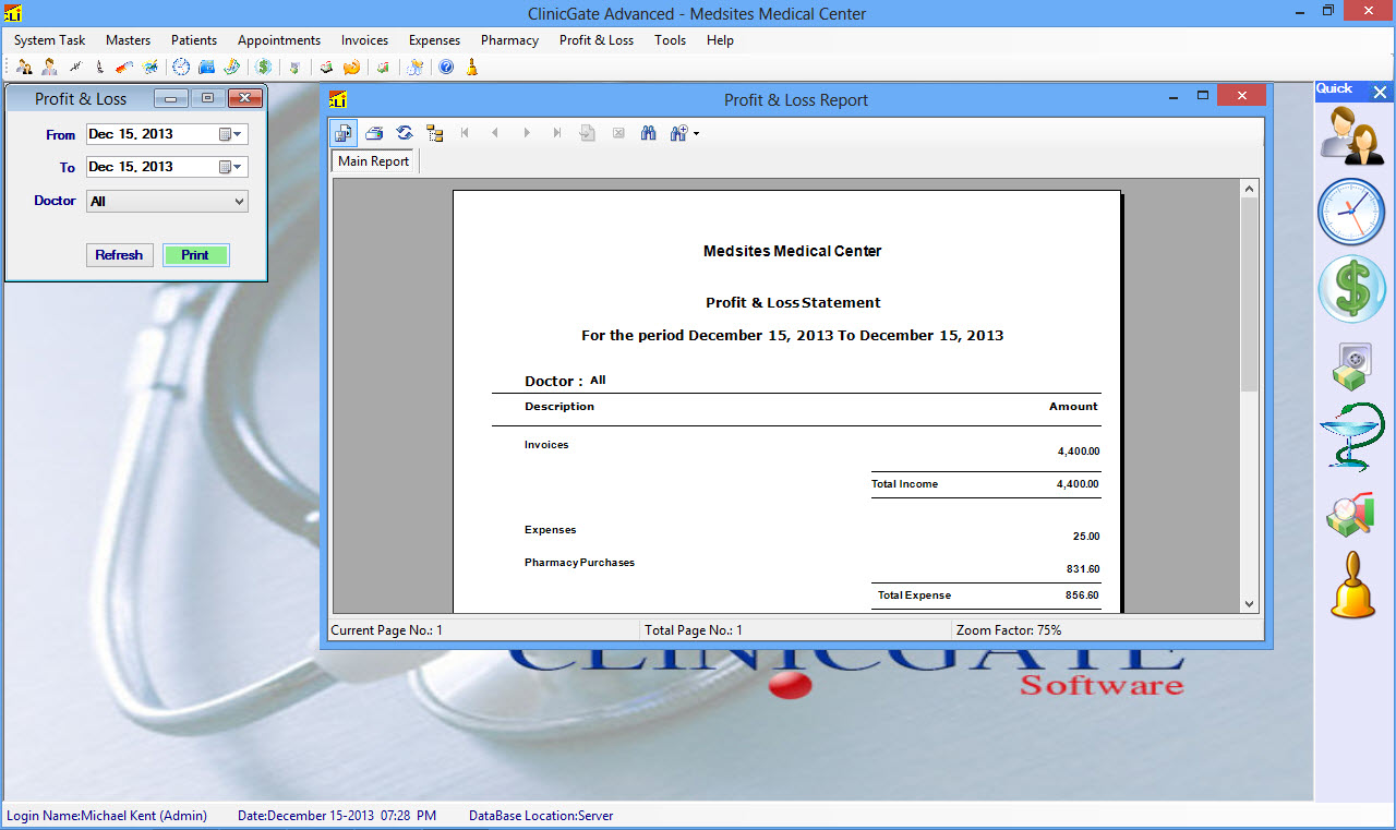 Ver e imprimir las ganancias y pérdidas diarias, mensuales y anuales de todos los médicos