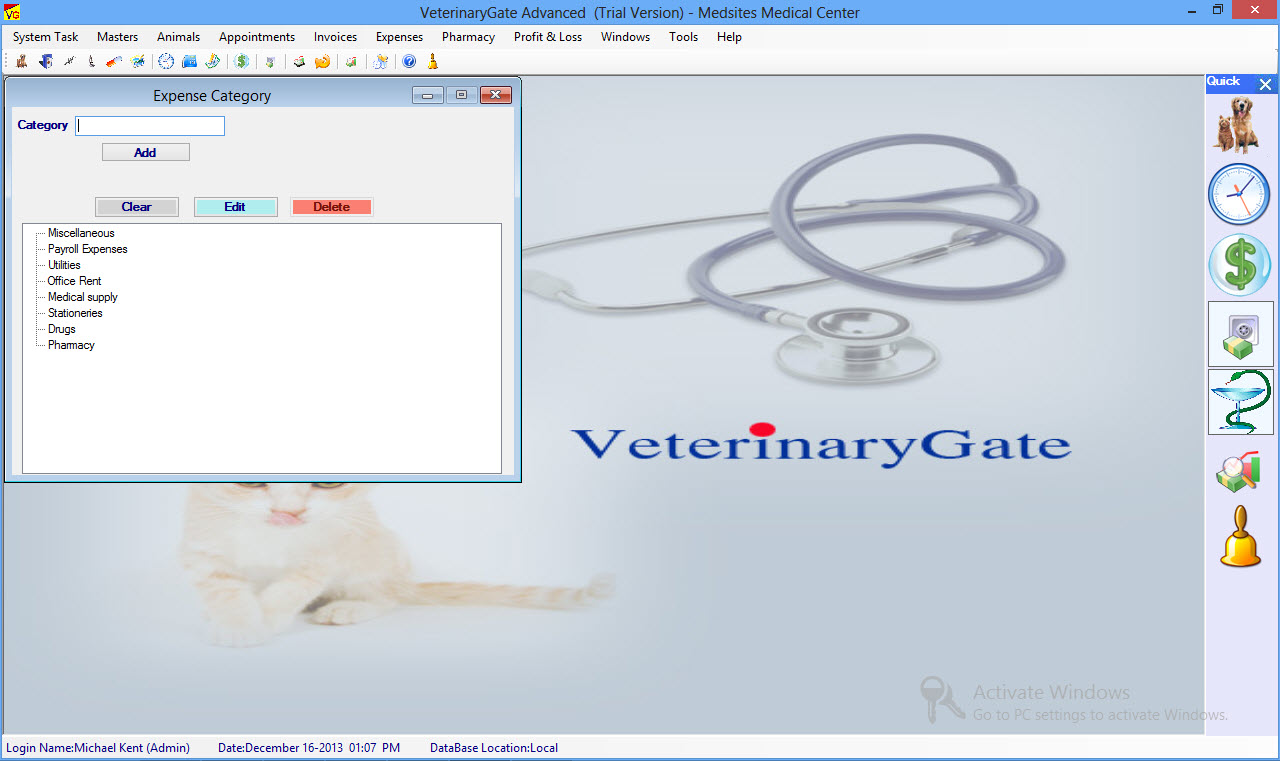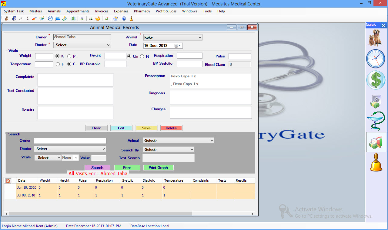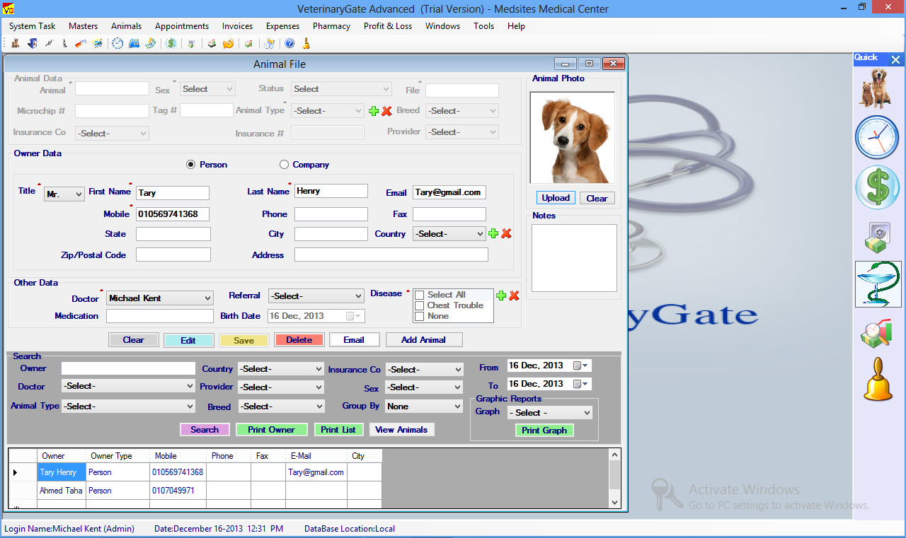 VeterinaryGate is a Veterinary Software, Veterinary Office Billing Software, Practice Management Software offers an easy to use Windows interface featuring an integration of Animal & Pet Medical Records, Appointment Scheduling, Billing, Tracking Receivables, Managing Expenses and Generating Customized Reports And Graphic Reports.