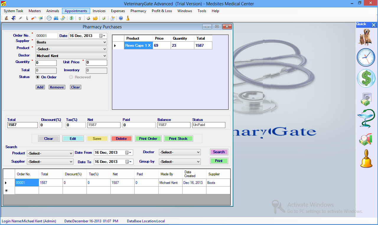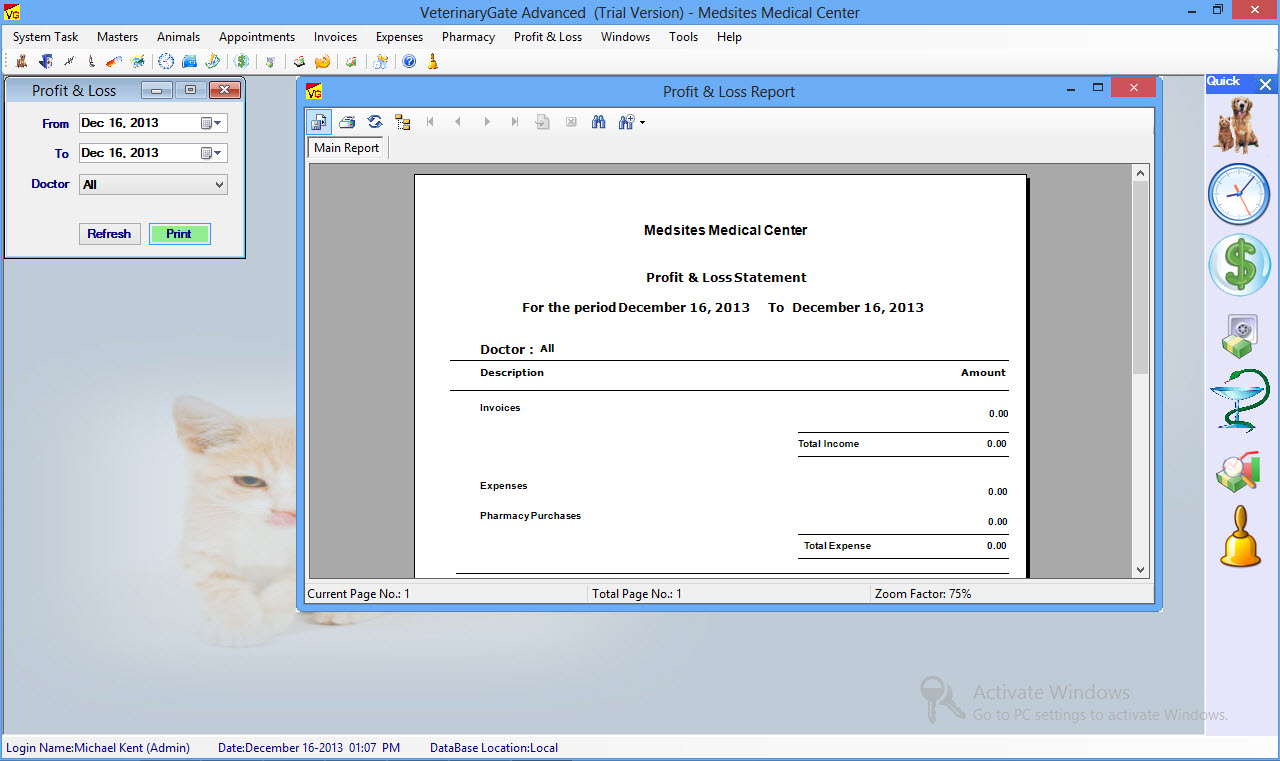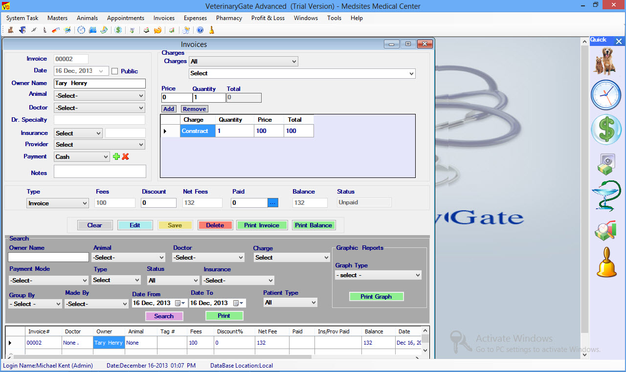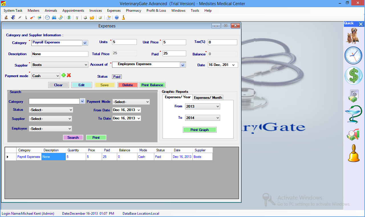 VeterinaryGate is a Veterinary Software, Veterinary Office Billing Software, Practice Management Software offers an easy to use Windows interface featuring an integration of Animal & Pet Medical Records, Appointment Scheduling, Billing, Tracking Receivables, Managing Expenses and Generating Customized Reports And Graphic Reports.