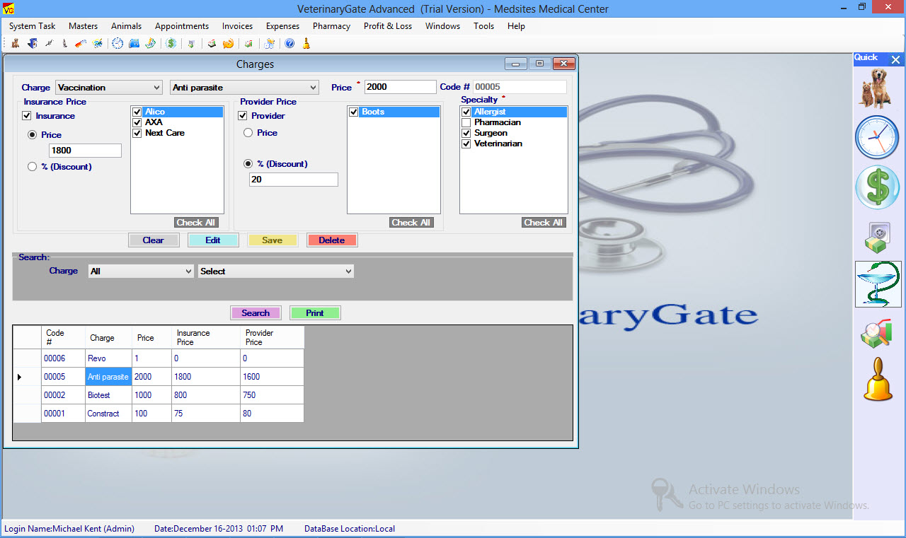 Add, Edit & Delete Practice Charges by Specialty