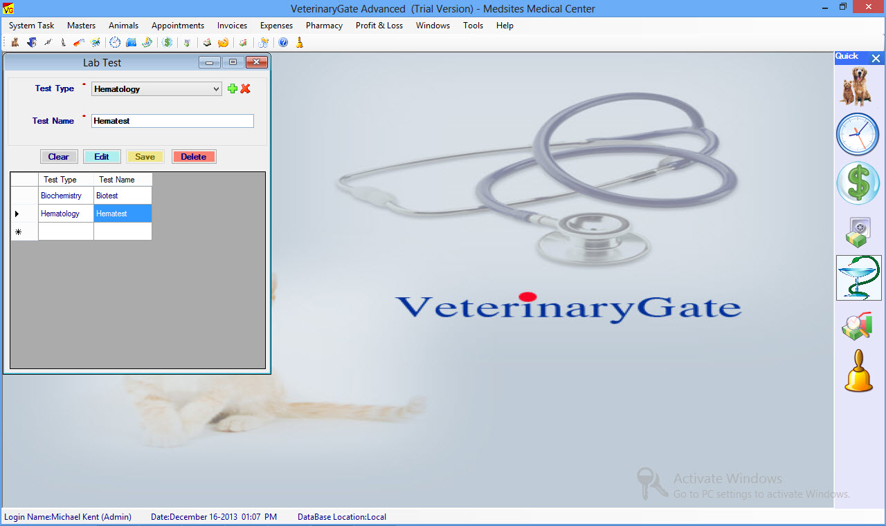 Add, Edit & Delete Animal Lab Test
